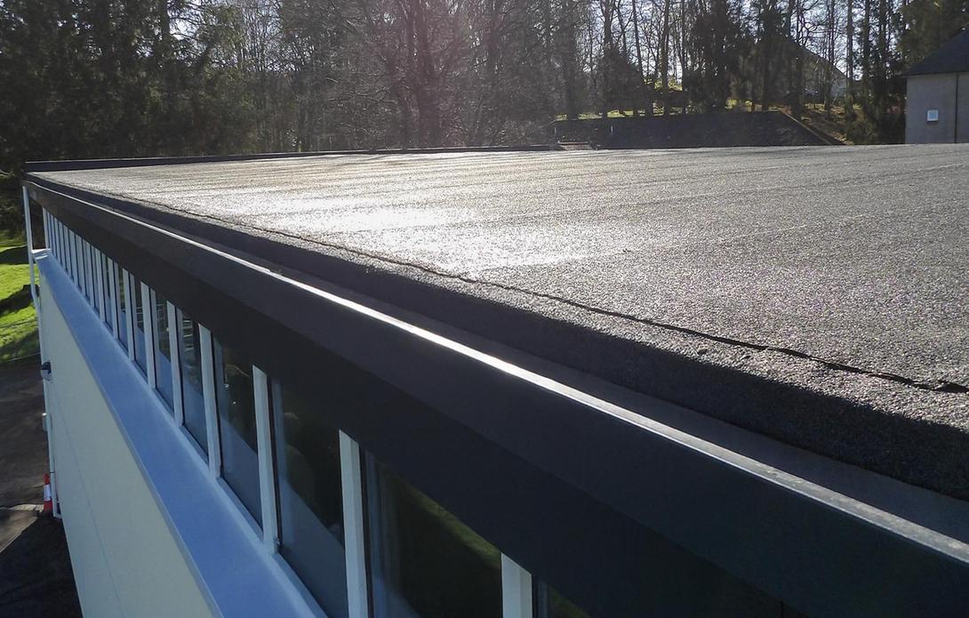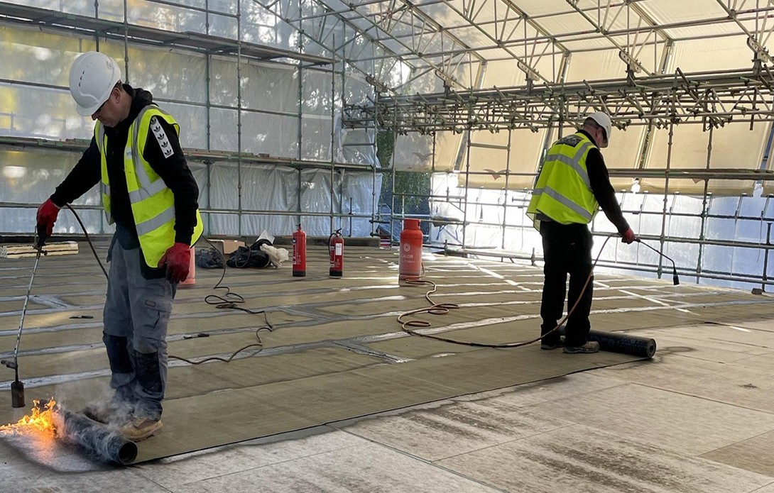 Essential to the roof refurbishment and removal of the RAAC panels was our installation of a new acoustic metal deck, vapour control layer, tapered insulation, and two layers of high-performance elastomeric felt membrane. By upgrading the property's drainage system with aluminium gutters and downpipes, we improved the material's aesthetic and longevity, and enhanced the roof's long-term performance.