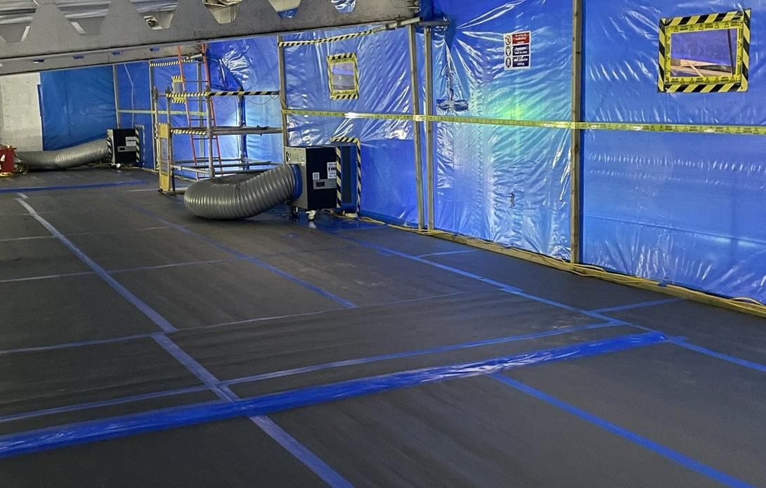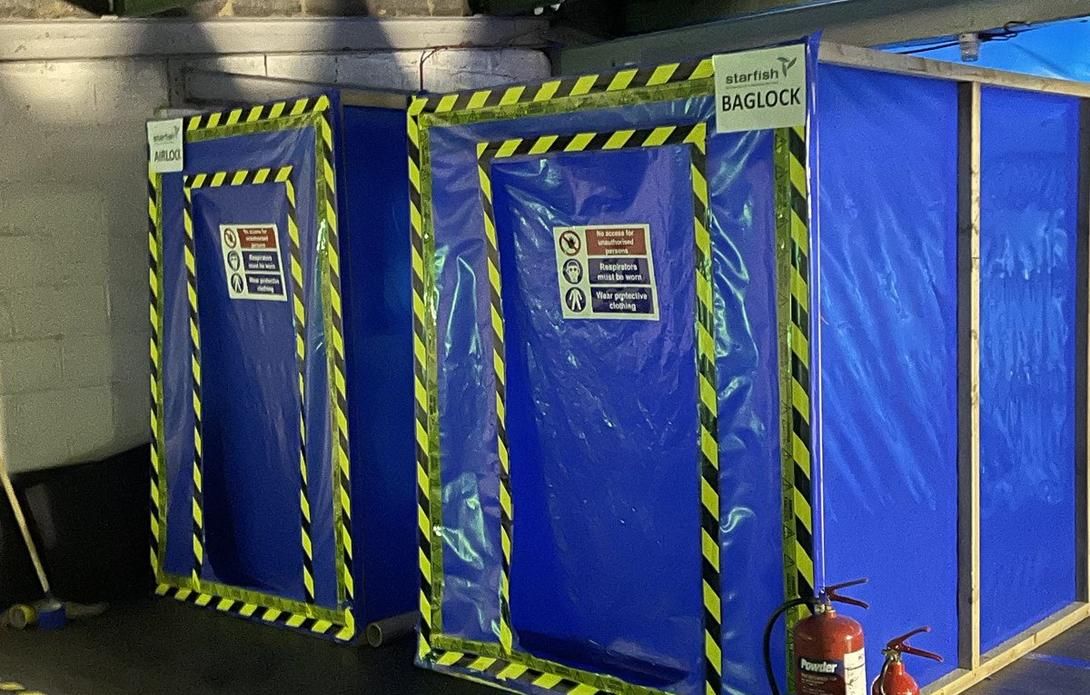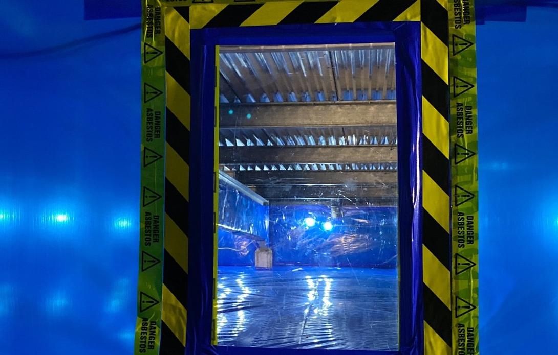 We installed an airlock system to enable safe decontamination procedures for the removal team and an oversized enclosure to accommodate the large parcels involved in an intact removal. SEAS also installed three intrinsically safe extraction units to create negative pressure within the removal areas and to manage air inside the enclosure. Additionally, we set up a series of vision panels to facilitate observation and supervision from outside the removal zone.
